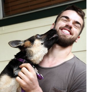 When a young footballer, Damian (above, being licked), collapsed with a major stroke at the end of footy training, it should have meant he would spend the rest of his life receiving rehab and struggling to overcome the symptoms of such significant brain trauma.